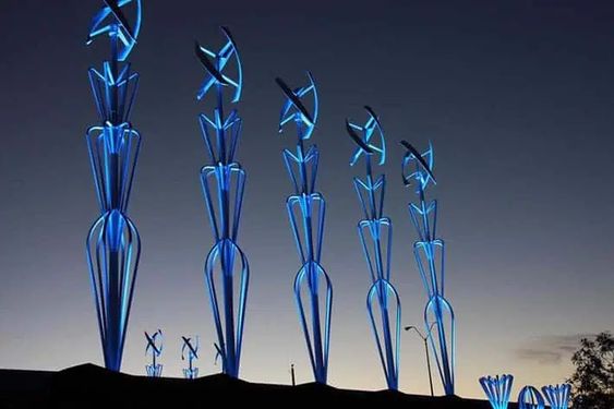 This installation above can be found just outside El Paso airport in Texas. It consists of an array of 16 15-ft vertical wind turbines. Each is lit from below with LED lights. The lights can even be programmed to celebrate the seasons or other events in the area.